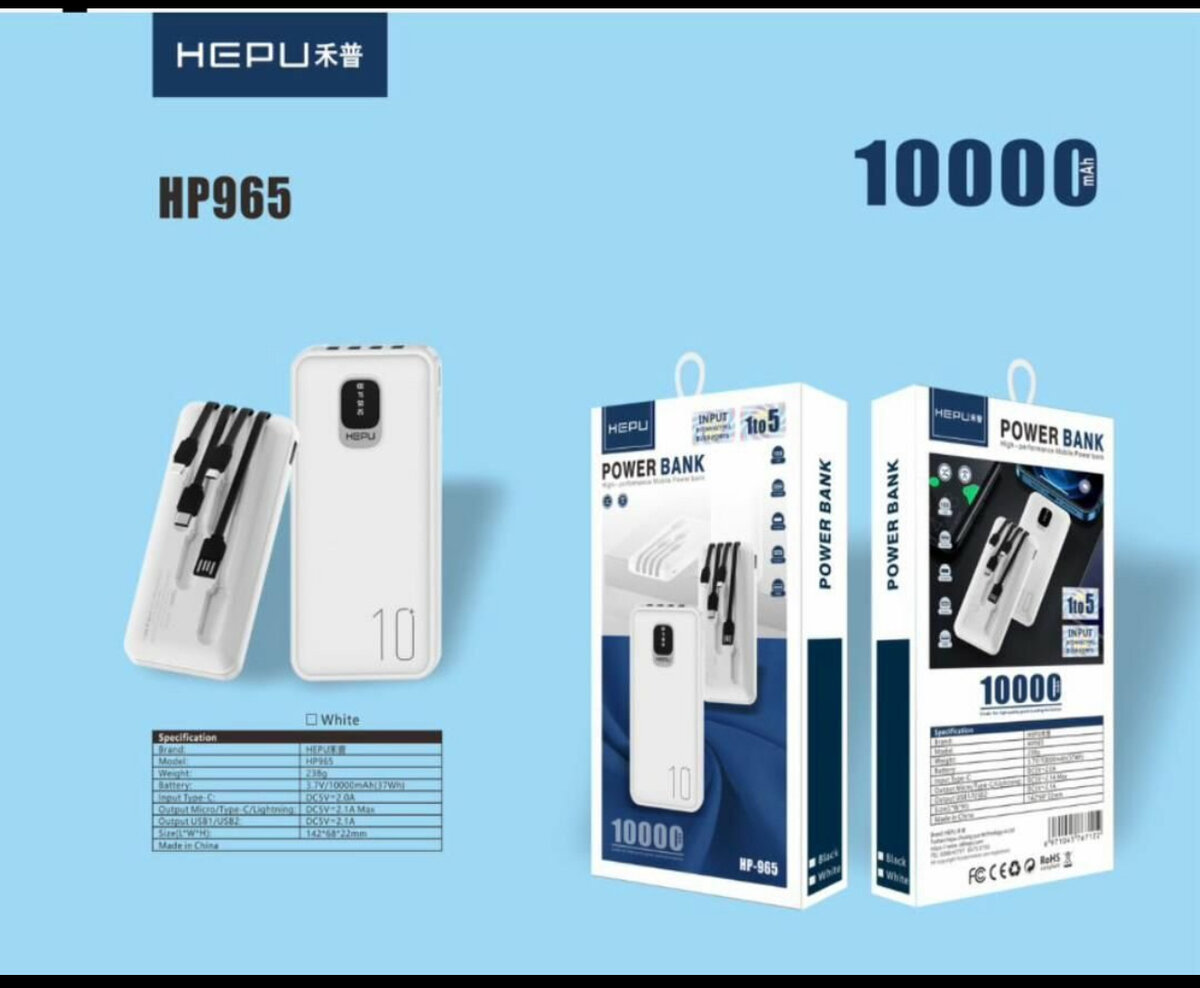 Compact and powerful HEPU HP965 power bank with 10000mAh capacity. Ideal for on-the-go charging, featuring built-in cables for convenience. Perfect for travelers and busy professionals looking for reliable backup power.