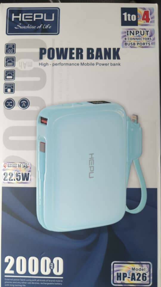 Chargez vos appareils en toute simplicité avec la Power Bank HEPU 20000mAh. Compacte et performante, elle offre des ports USB variés pour une connexion facile. Parfait pour tous vos déplacements.