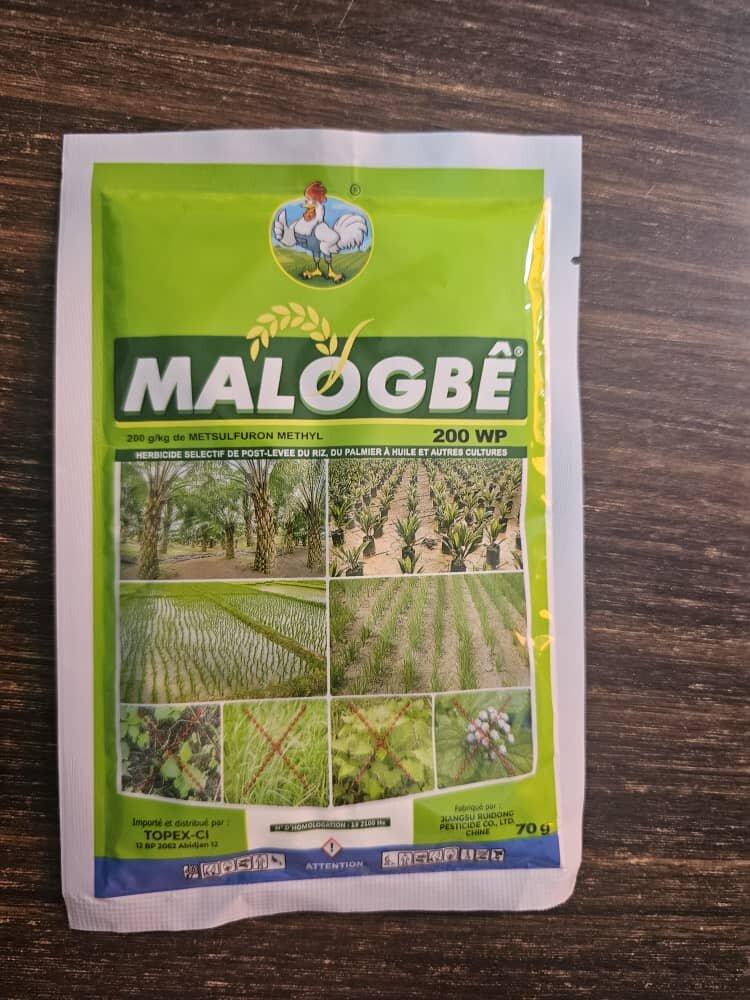 Herbicide efficace Malogbé 200 WP pour protéger vos plantations. Idéal pour le riz et les palmiers. Contient 200 g/kg de méthyl metsulfuron.