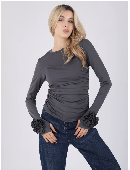 Элегантные роза на руках придают изделию особую нежность , романтичность, и оригинальность. Лонгслив выполнен из приятного к телу материала, который обеспечивает комфорт на весь день. Эта стильная блузка с длинными рукавами с цеточками на рукавах — отличное дополнение к вашему гардеробу.