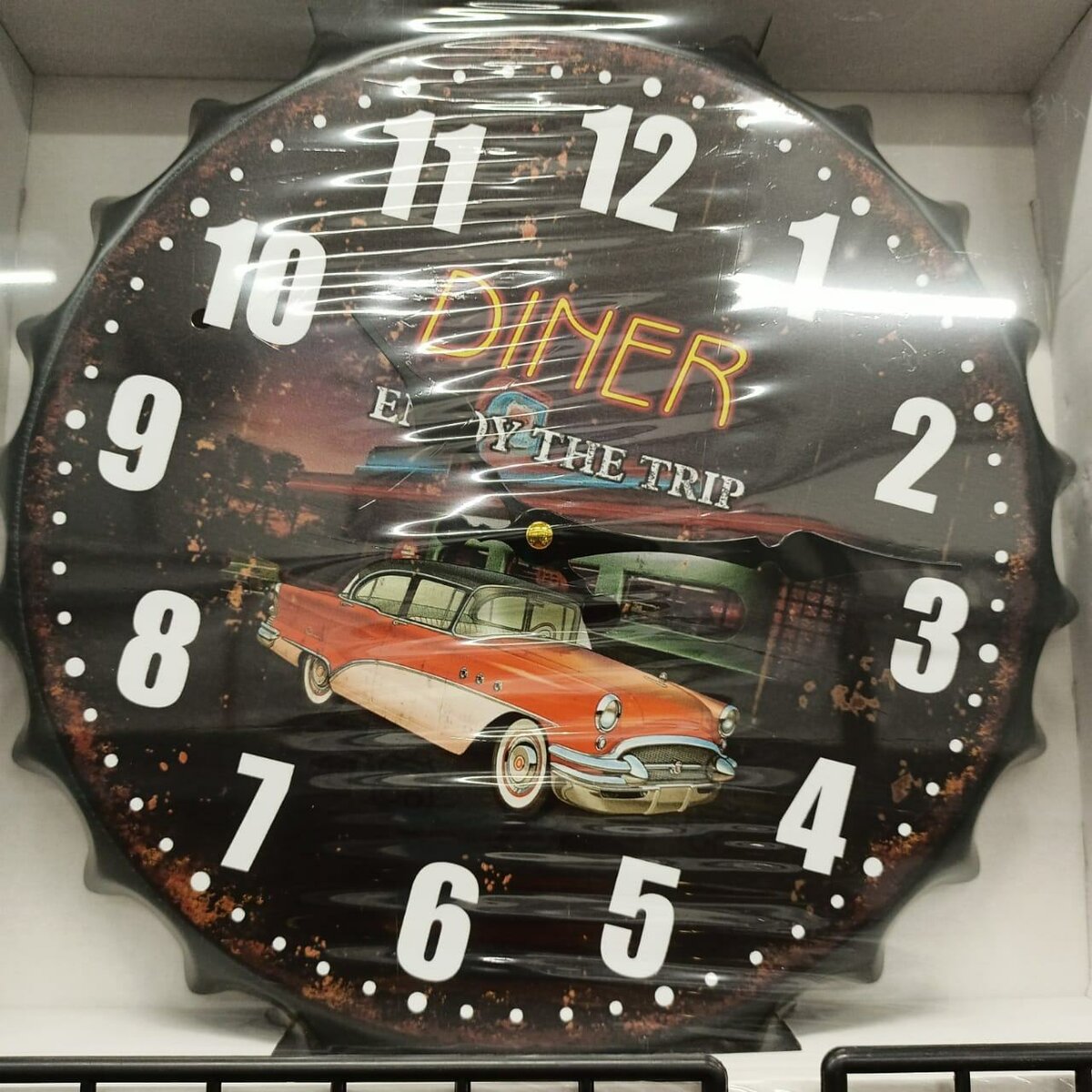 Ajoutez une touche rétro à votre décoration avec cette horloge murale vintage style bouchon. Parfaite pour les amateurs de diner américain, avec son design voiture classique.