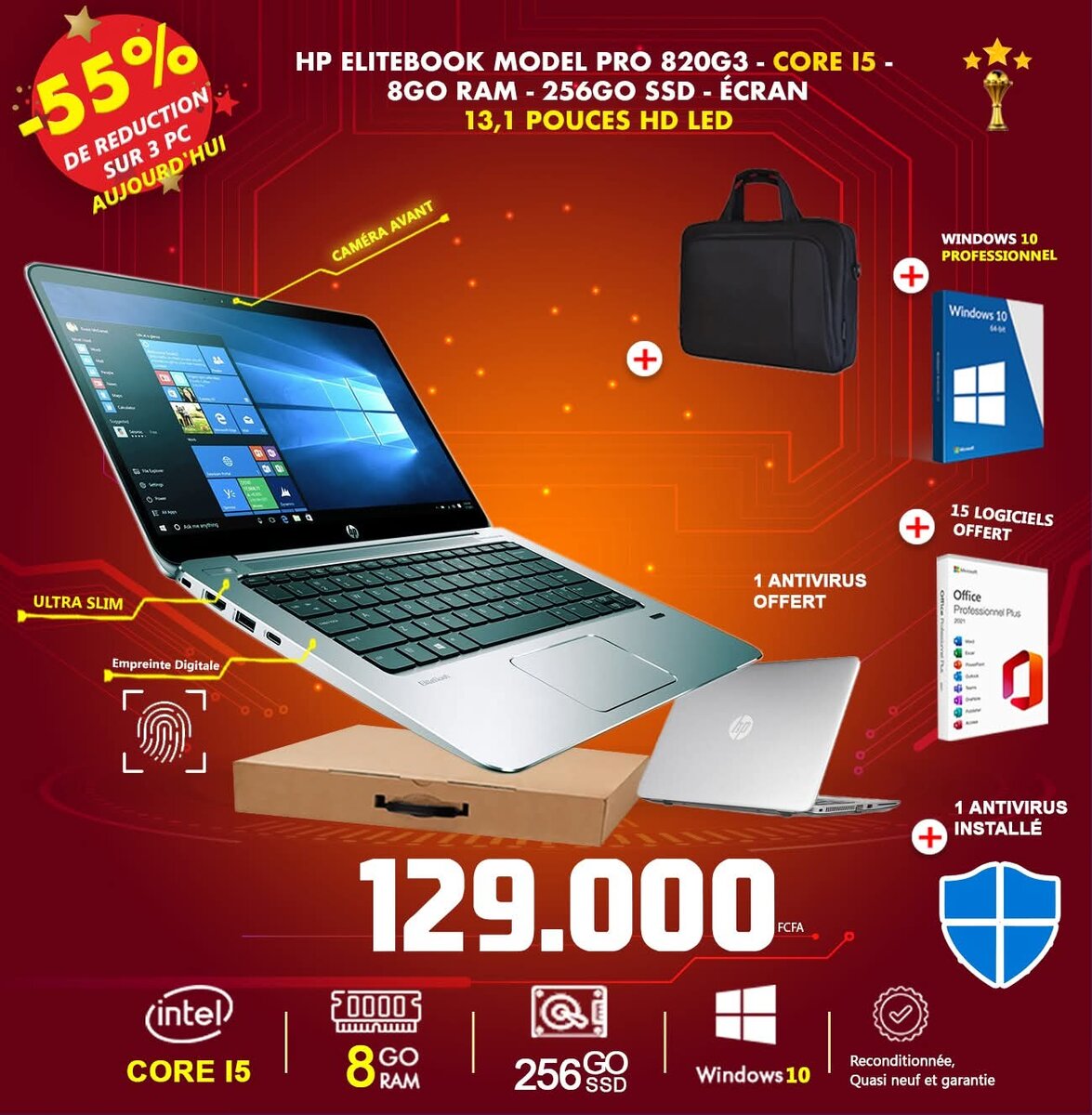 Optez pour le HP EliteBook 820 G3 avec processeur Core i5, 8Go RAM et SSD 256Go. Idéal pour une performance optimale avec écran 13,1" HD LED. Windows 10 Pro préinstallé avec 15 logiciels inclus et antivirus. Parfait pour les professionnels exigeants.