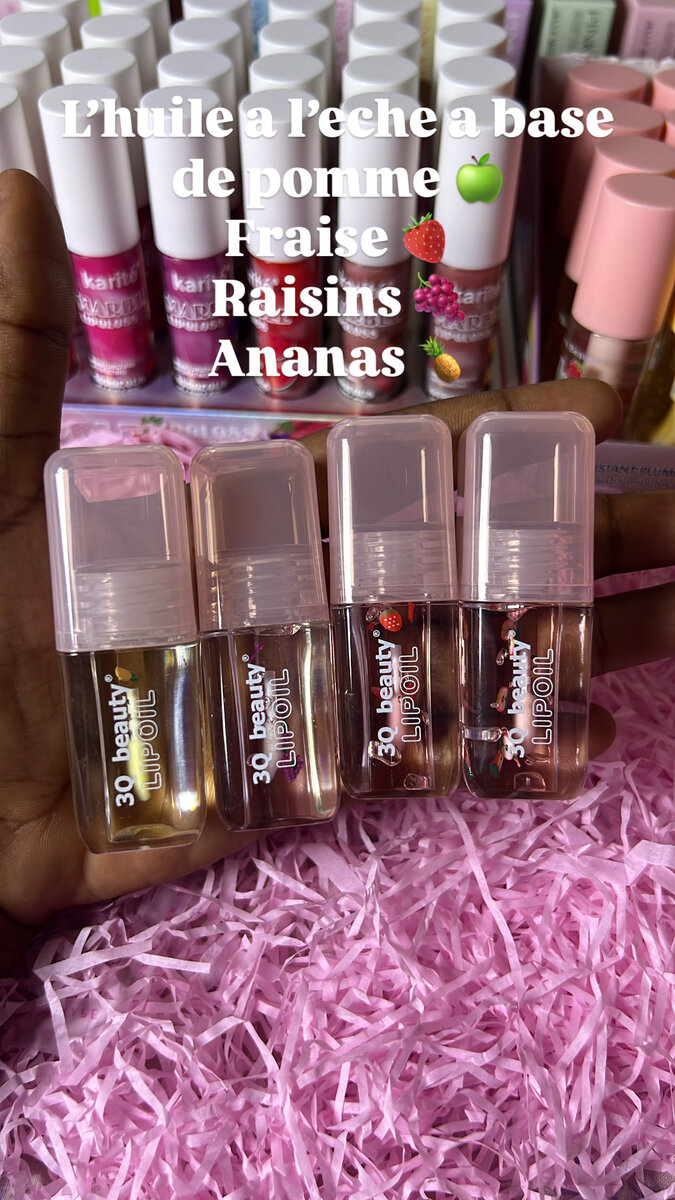 Découvrez notre huile à lèvres parfumée avec des arômes délicieux de pomme, fraise, raisins et ananas. Enrichie pour une hydratation et une brillance longue durée. Parfait pour embellir vos lèvres avec des senteurs fruitées.