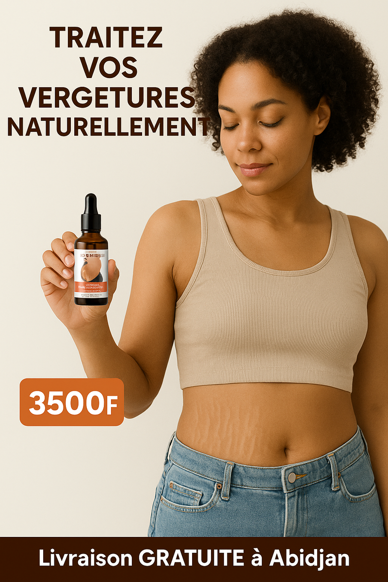 Transformez votre peau avec notre huile anti-vergetures naturelle. Formulée pour hydrater et restaurer l'élasticité, idéale pour les femmes enceintes et jeunes mamans. Offrez à votre peau le soin qu'elle mérite. Livraison gratuite à Abidjan.