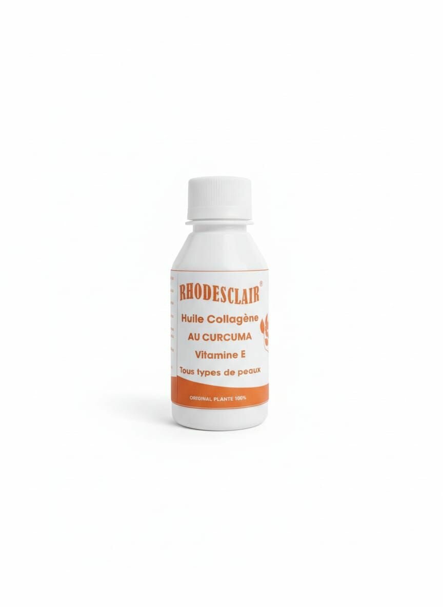 Découvrez l'Huile Collagène au Curcuma RHODESCLAIR, enrichie en vitamine E, pour tous les types de peau. Soin revitalisant et nourrissant pour une peau éclatante et saine.