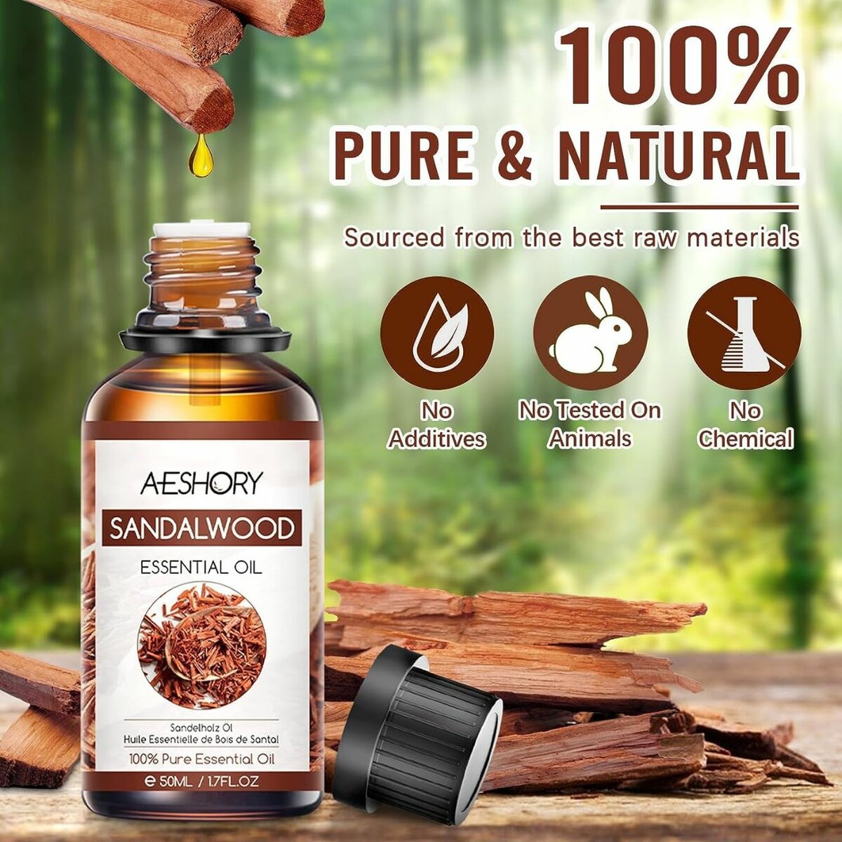Huile Essentielle de Bois de Santal 50ML, 100% Pure & Naturelle pour Diffuseur, Huile Parfumée Aromathérapie pour Améliorer la Peau, Rafraîchissant