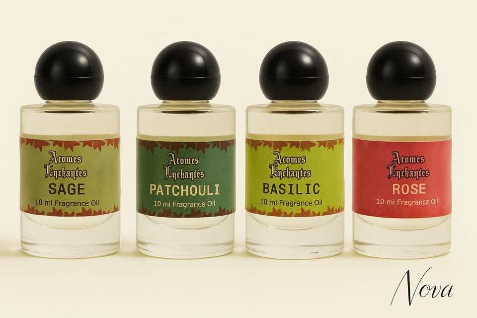 Découvrez la pureté des huiles parfumées Aromes Enchantes. Variétés : Sauge, Patchouli, Basilic, Rose. Parfaites pour créer une ambiance apaisante et aromatique. Idéal pour la maison ou le bureau.
