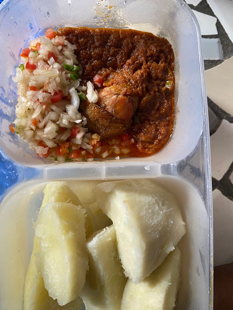 Savourez ce plat délicieux digname kponan bouillie accompagné du Poulet frit et sa vinaigrette