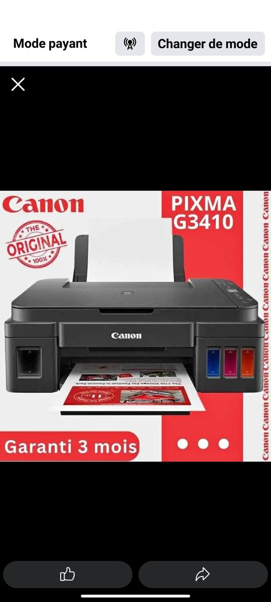 Explorez l'impression de haute qualité avec l'imprimante Canon PIXMA G3410. Idéale pour la maison ou le bureau, cette imprimante offre une excellente qualité d'encre et une connectivité Wi-Fi. Sa simplicité d'utilisation et sa garantie de 3 mois en font un choix incontournable pour vos besoins d'impression quotidiens.