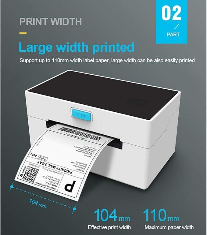 Imprimante d'étiquettes compacte avec deux modes d'impression : rouleau et cascade. Capteur double pour un positionnement précis. Largeur d'impression jusqu'à 110mm. Idéal pour les professionnels, la logistique et la gestion des stocks.