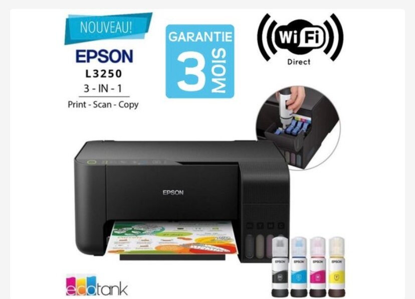 Découvrez l'imprimante Epson L3250, votre solution tout-en-un pour imprimer, scanner et copier efficacement. Profitez de la technologie WiFi pour une connectivité sans fil facile et de l'économie grâce aux réservoirs d'encre EcoTank. Idéale pour le bureau ou la maison.