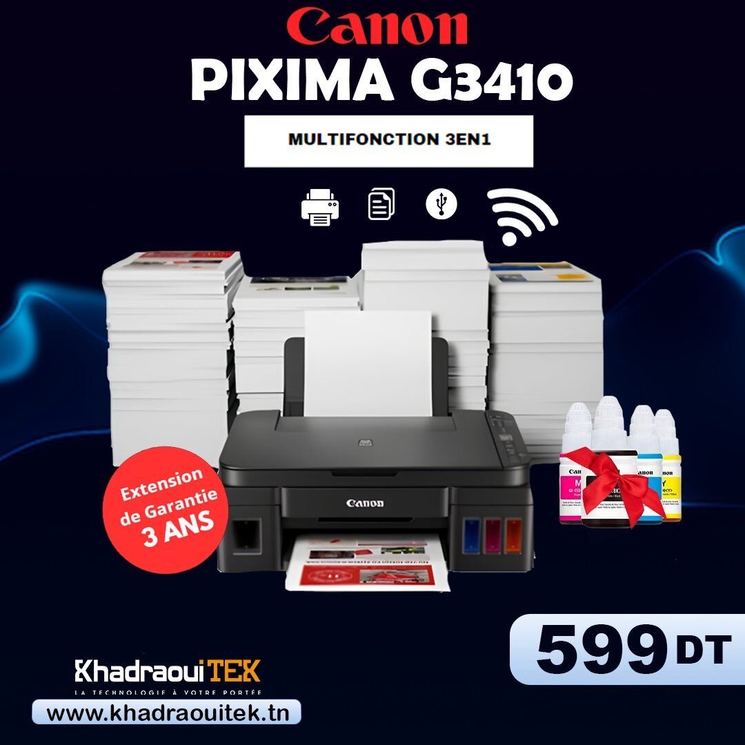 l'imprimante multifonction Canon PIXMA G3410, parfaite pour imprimer des documents et des photos de haute qualité. Équipée du Wi-Fi pour une connexion facile et livrée avec 4 bouteilles d'encre .