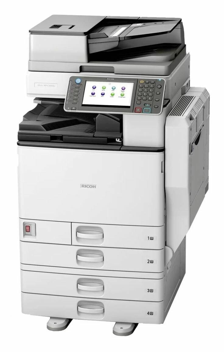Imprimante multifonction Ricoh pour un usage professionnel. Équipée d'un écran tactile et de plusieurs tiroirs pour une grande capacité de papier. Idéale pour les bureaux et les environnements de travail exigeants.