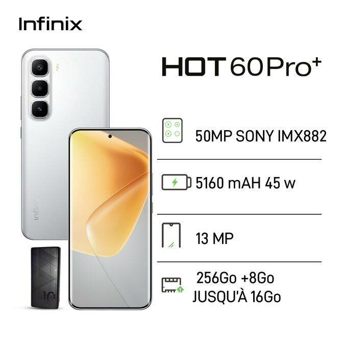 Découvrez le smartphone Infinix HOT 60 Pro+ avec appareil photo 50MP, batterie 5160 mAh et 256Go de stockage. Idéal pour capturer chaque moment et gérer toutes vos applications sans effort.
