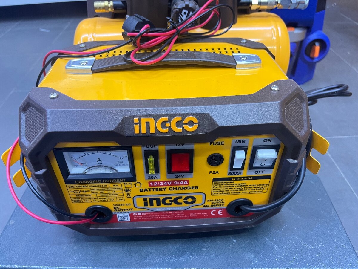 Chargeur de batterie Ingco 12/24V avec fonction boost. Idéal pour recharger rapidement vos batteries automobiles. Compact et facile à utiliser, il offre une sécurité optimale grâce à ses fonctionnalités intégrées. Parfait pour les ateliers et les particuliers.