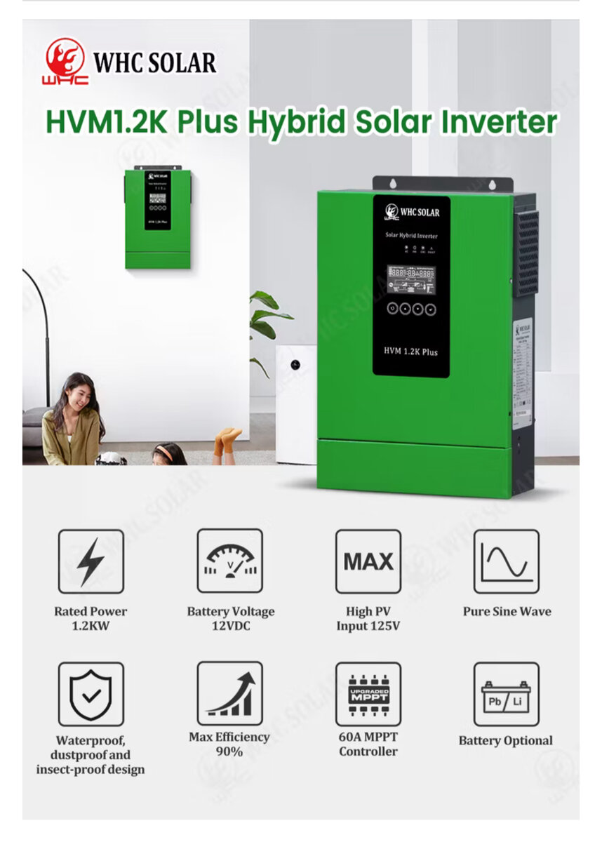 Transformez l'énergie solaire en électricité fiable avec l'inverter solaire hybride HVM1.2K Plus de WHC. Puissant et efficace, il offre une capacité de 1.2KW avec un affichage LCD clair. Idéal pour alimenter votre maison durablement.