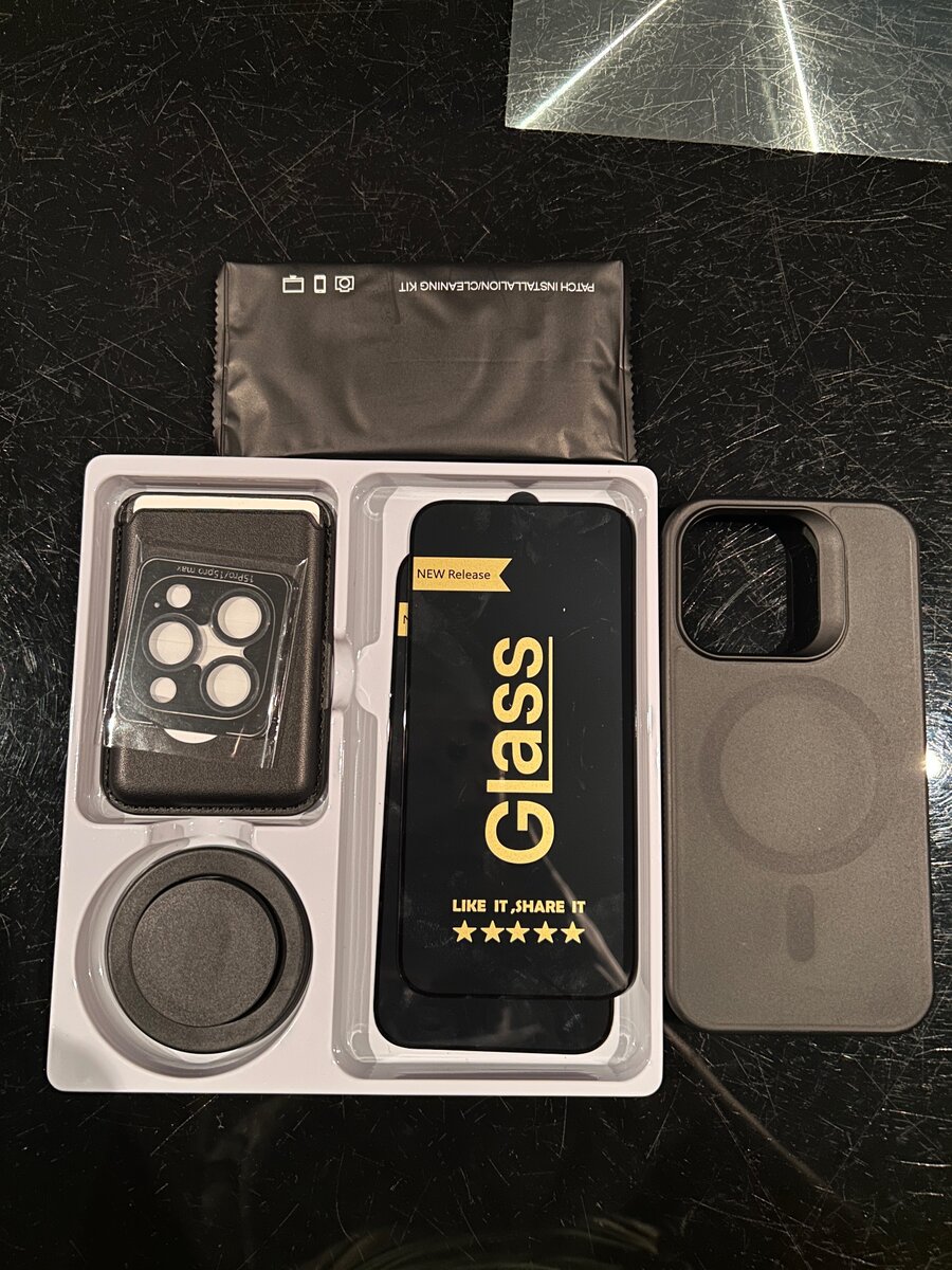 Magnetic case (black) Two 9H glass protectors, Magnetic holder Two camera protectors Card holder Wipes and sticker guides
