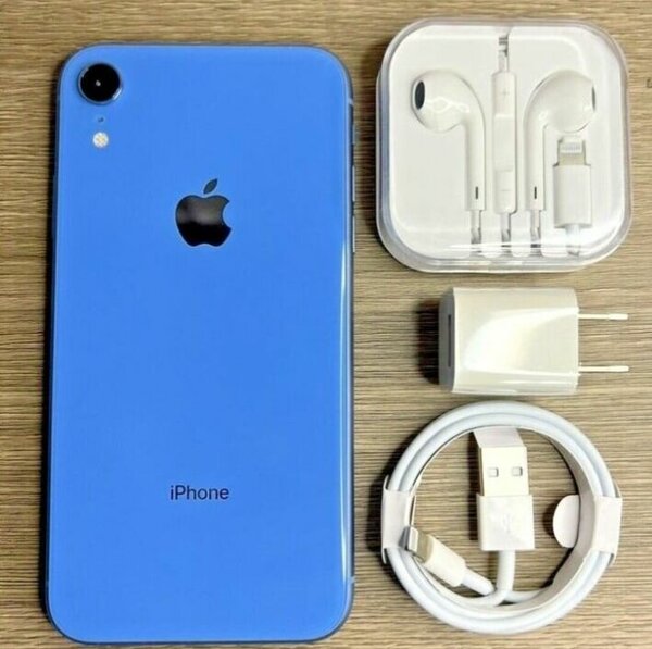 iPhone XR bleu avec accessoires Apple