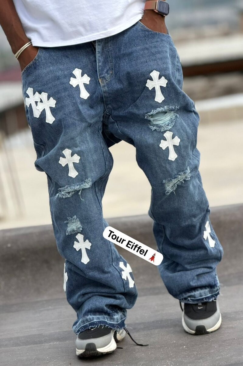 Adoptez un look unique avec ce jean baggy orné de croix. Idéal pour un style urbain et décontracté, ce pantalon en denim offre confort et tendance. Parfait pour exprimer votre personnalité, il s'associe facilement à vos tenues préférées. Fait pour ceux qui cherchent à se démarquer.