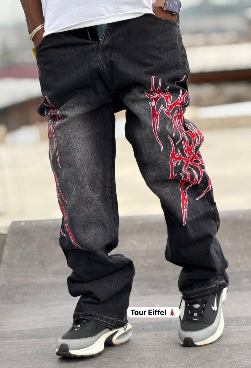 Découvrez notre jean baggy noir avec motifs graphiques rouges. Confort et style réunis pour une allure moderne et tendance. Parfait pour un look décontracté et urbain.