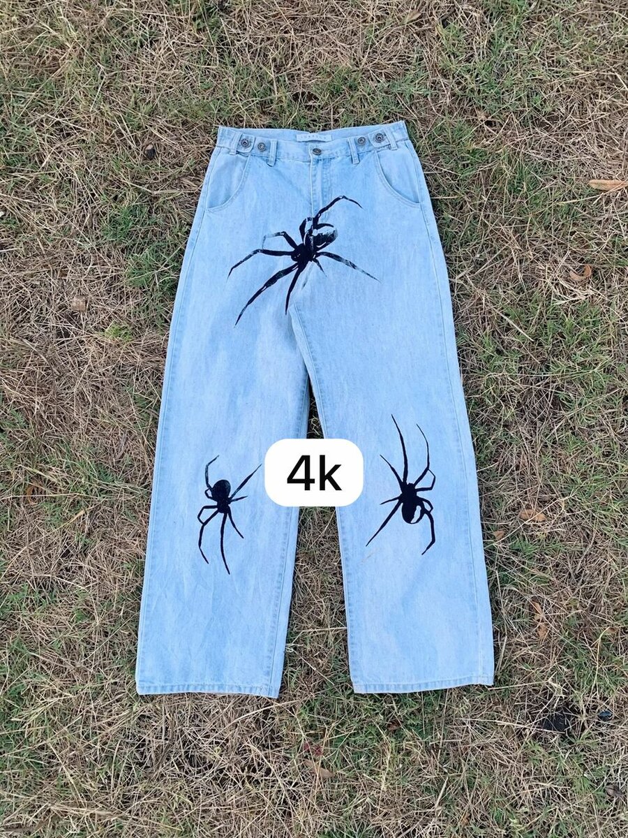 Découvrez ce jean bleu unique avec des motifs de grandes araignées noires, parfait pour ajouter une touche audacieuse à votre garde-robe. Fabriqué en denim de haute qualité, ce pantalon est à la fois confortable et résistant. Idéal pour ceux qui osent afficher un style distinctif, il peut être porté pour des sorties décontractées ou pour faire une impression lors de soirées entre amis. Ne suivez pas la foule, affirmez votre style avec ce jean araignée!