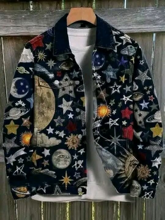 Veste en jean personnalisée avec des motifs de planètes et d'étoiles. Parfaite pour un look unique et tendance, cette veste est idéale pour les amateurs de mode streetwear.