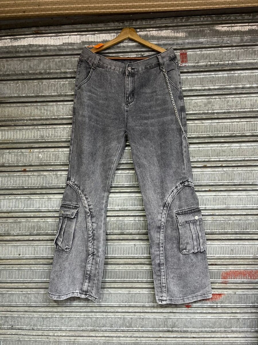 Découvrez ce pantalon cargo en jean gris clair délavé, parfait pour un look streetwear élégant. Conçu en denim de qualité, il présente une coupe ample avec des poches cargo sur les côtés et une fermeture éclair sur le devant. Idéal pour les amateurs de mode urbaine.
