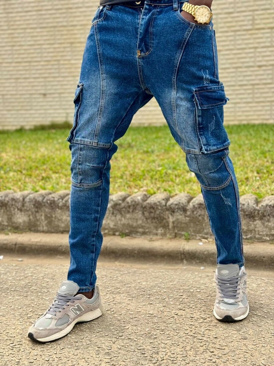 Optez pour un look urbain avec ce jean cargo homme tendance. Conception résistante et poches multiples pour un style pratique et moderne. Convient parfaitement aux sorties décontractées ou à une tenue streetwear.