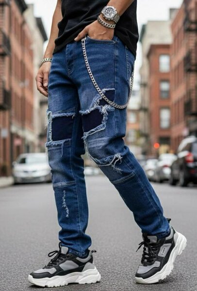 Découvrez le style urbain avec ce jean cargo tendance. Doté de poches fonctionnelles et de chaînes décoratives, il est parfait pour un look moderne et audacieux. Fabriqué en denim robuste, idéal pour les sorties en ville ou les occasions décontractées. Un choix parfait pour ceux qui aiment allier confort et mode.