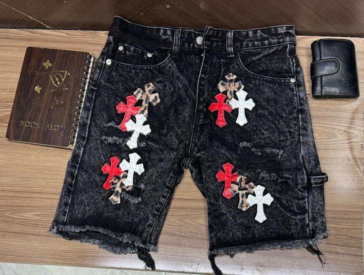 Des shorts en jean noirs avec des croix rouges et blanches brodées. Confortables et tendances, parfaits pour un style urbain et décontracté.