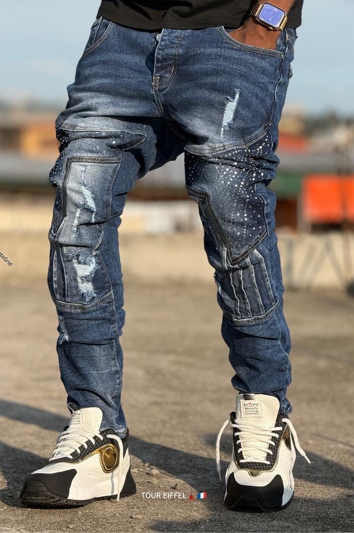 Jean blue décontracté pour homme avec détails élégants en strass. Parfait pour un look tendance et audacieux. Idéal pour sorties décontractées ou occasions spéciales.