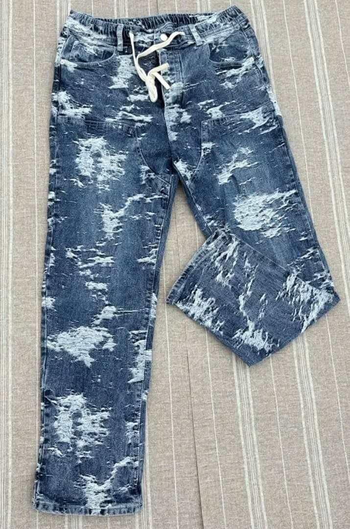 Pantalon en jean décontracté pour homme, effet usé tendance. Confortable avec cordon ajustable. Parfait pour un look urbain moderne. Idéal pour sorties décontractées ou soirées.