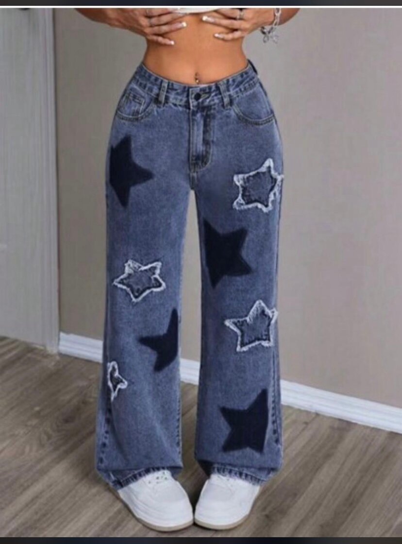Jean évasé tendance avec des motifs étoiles audacieux. Parfait pour un look décontracté et stylé. Idéal pour celles qui veulent se démarquer avec une pièce unique.