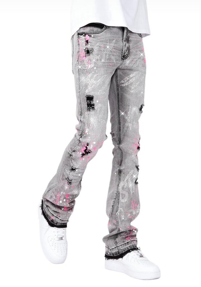 Jean moderne gris avec motifs peints à la main. Idéal pour un look urbain et tendance. Confortable et unique.