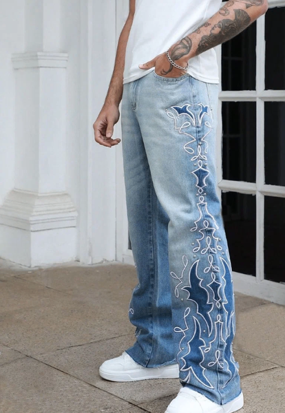 Découvrez ce jean large avec broderies uniques, alliant style tendance et confort. Idéal pour un look décontracté et chic au quotidien. Fabriqué en denim durable, il s'adapte à toutes les occasions.