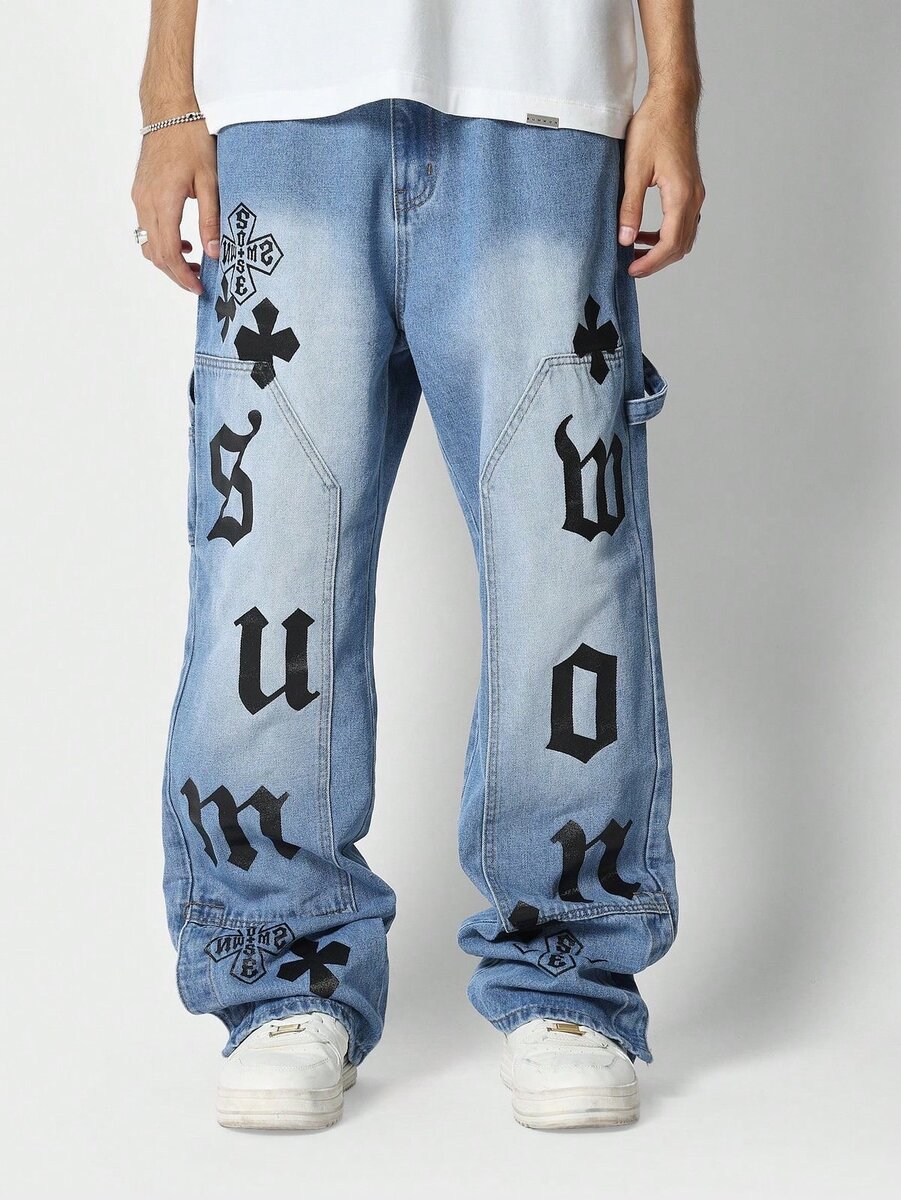 Jean large pour homme avec impression graphique audacieuse. Confortable et moderne, idéal pour un style urbain. Parfait pour toutes les occasions décontractées.