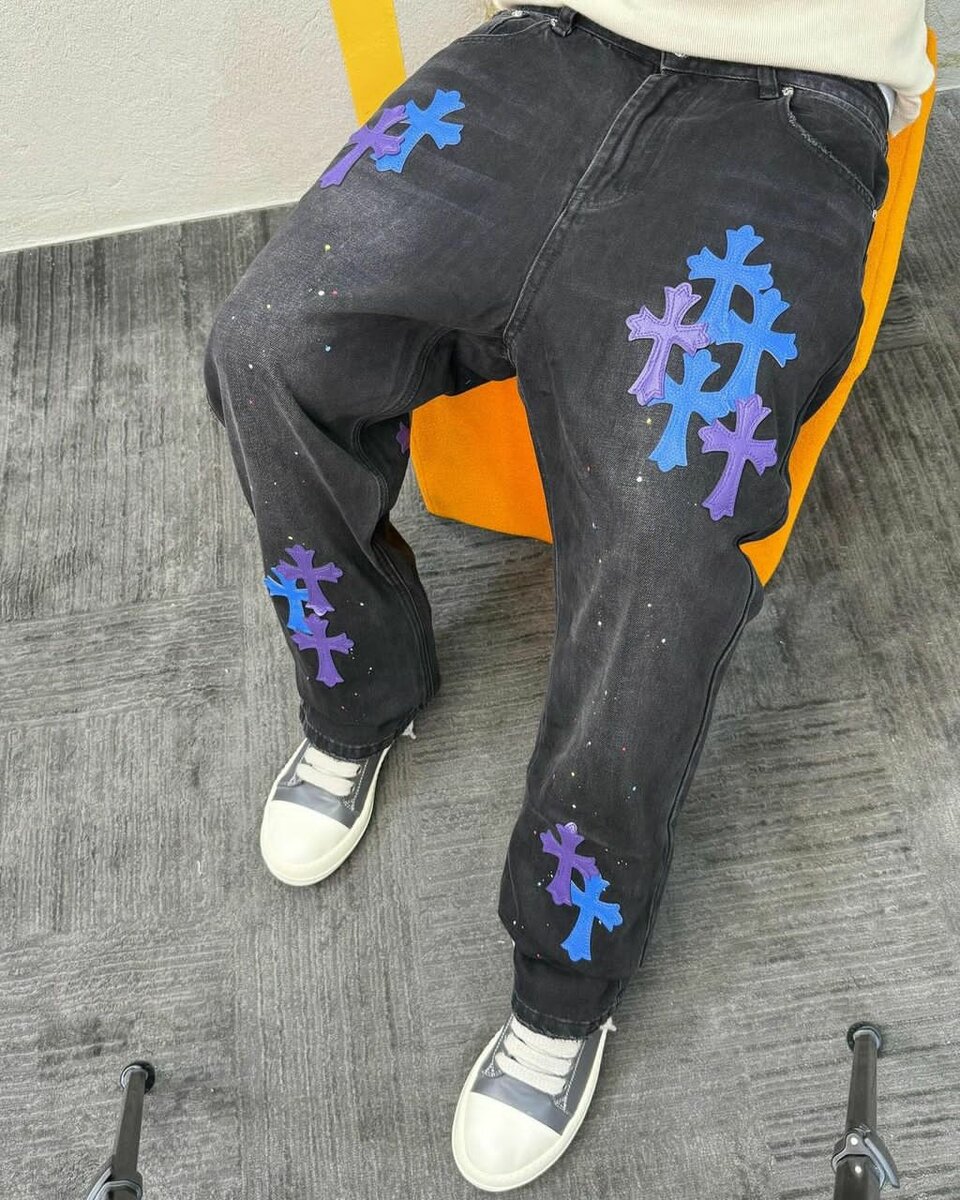 Découvrez un jean noir audacieux avec des motifs colorés bleu et violet. Parfait pour un style urbain unique. Conçu pour ceux qui veulent se démarquer!