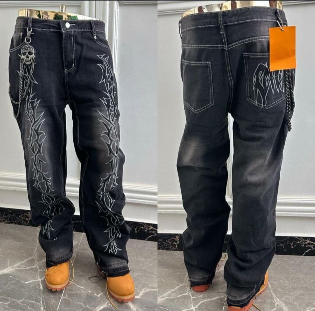 Découvrez ce jean noir audacieux pour homme avec des broderies uniques et un style décontracté. Parfait pour un look urbain, il est rehaussé par des chaînes et des détails originaux. Idéal pour sortir et afficher une personnalité forte et branchée.