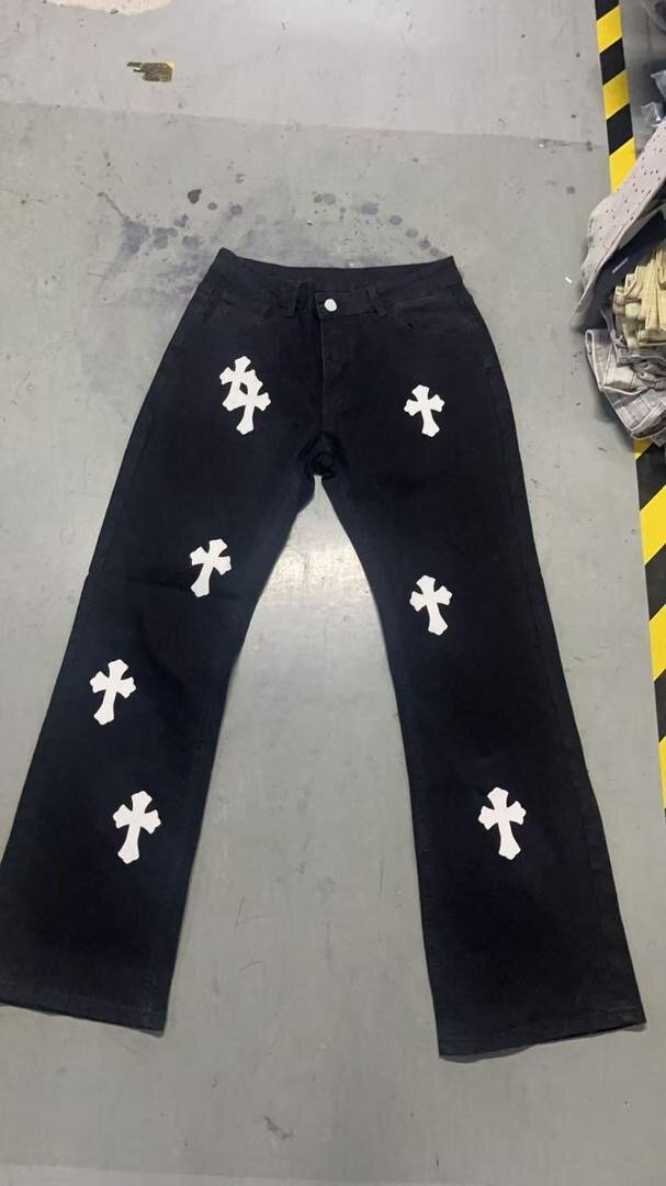 Jeans oversize avec croix décoratives blanches et noires. Conçu pour un look streetwear élégant et décontracté. Résistant et confortable.