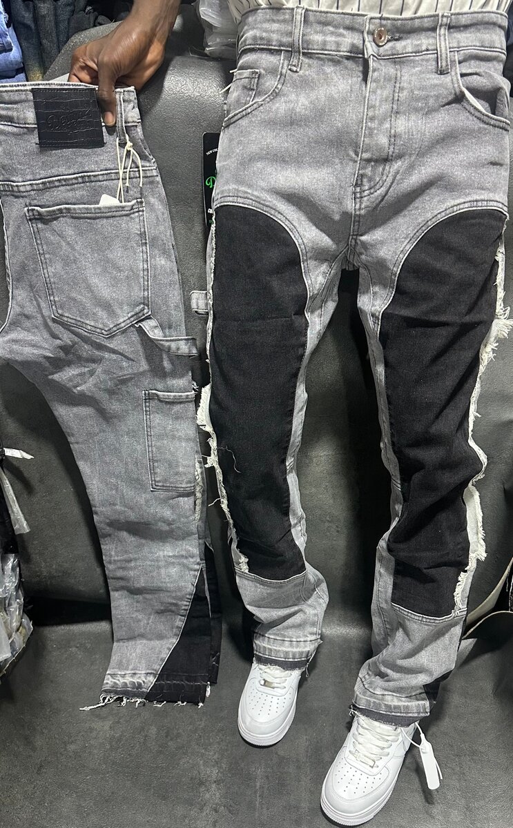 Jeans bicolores pour homme avec design unique et déchirures stylisées. Parfait pour un look audacieux et moderne. Idéal pour sorties décontractées et soirées.