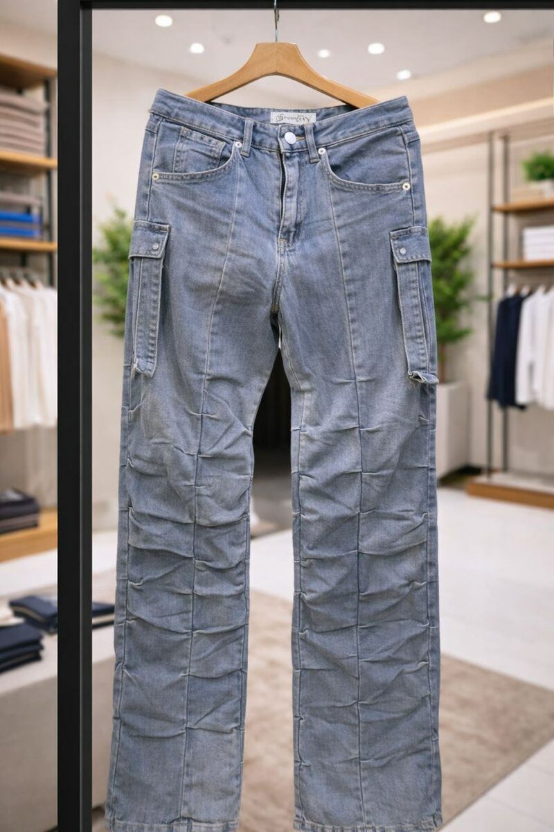 Jeans cargo bleu clair pour homme, style décontracté et confortable, poches latérales pratiques. Parfait pour un look urbain et tendance.