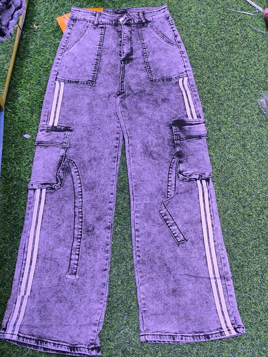 Jeans cargo taille haute pour femme, violet, avec poches latérales et détails de couture. Conçu pour un look urbain et moderne.