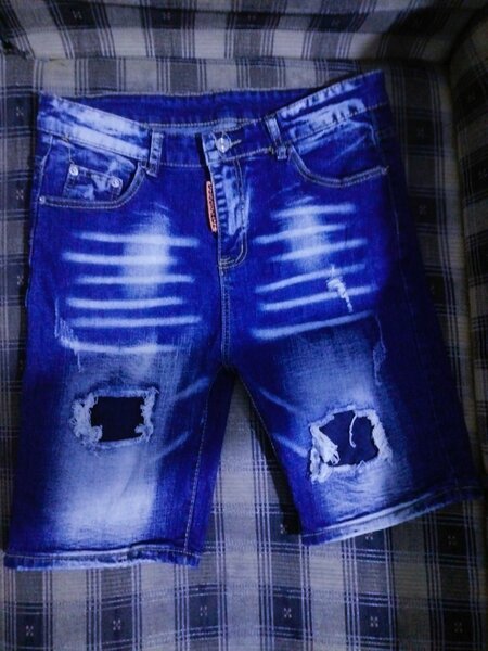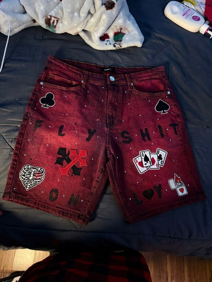 Ces jeans courts rouges uniques sont personnalisés avec des motifs originaux, notamment des cartes à jouer et des designs distinctifs. Parfaits pour ceux qui cherchent une touche d'individualité dans leur style.
