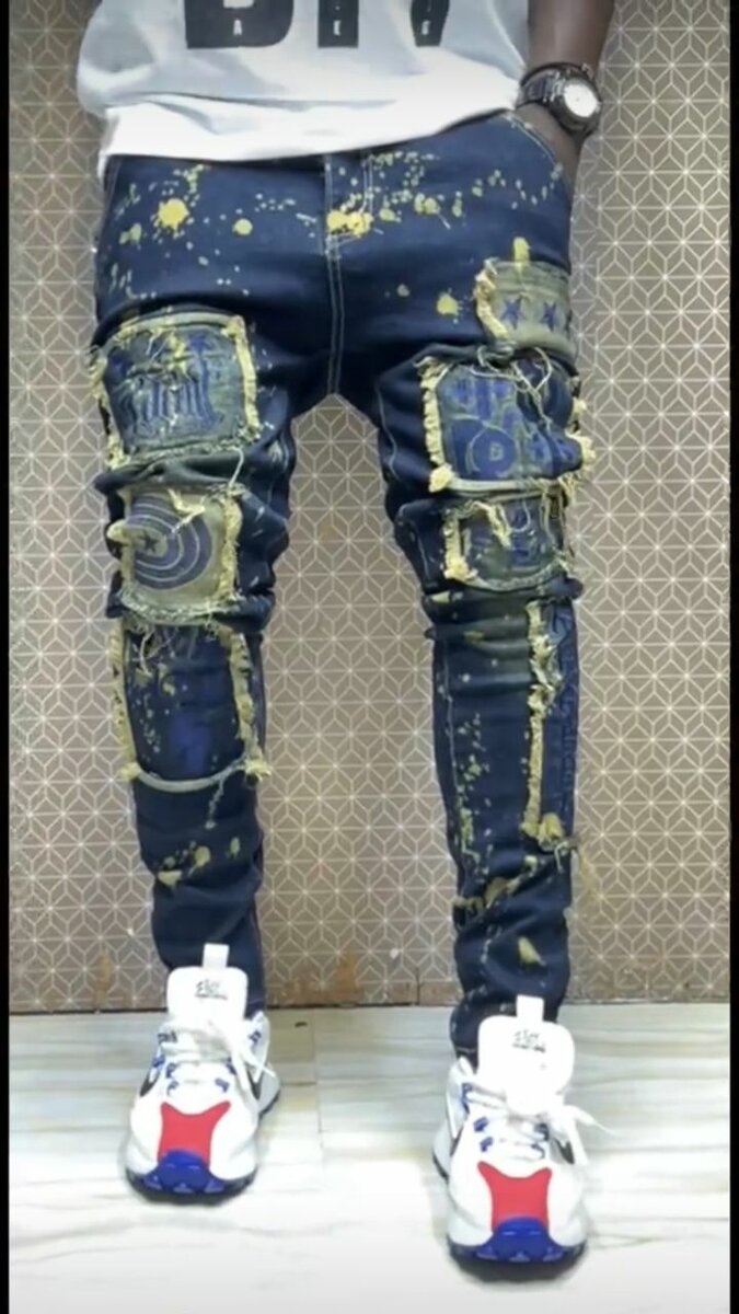 Optez pour le style audacieux avec ces jeans déchirés ornés de motifs peints. Fabriqués pour ceux qui aiment se démarquer, ils sont parfaits pour un look urbain moderne. Confortables et stylés, portez-les pour une journée décontractée ou une soirée entre amis.