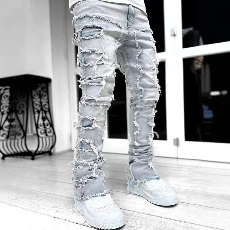 Jeans déchirés pour homme, style streetwear. Confortables et tendances, ces jeans sont parfaits pour un look décontracté.