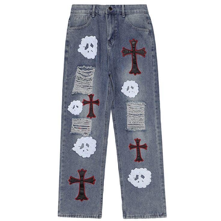 Explorez votre style unique avec ces jeans décontractés au design gothique. Avec des patchs crânes et croix rouges, ce pantalon est parfait pour une tenue audacieuse et tendance. Idéal pour les sorties casual ou les festivals.