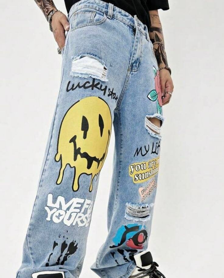 Exprimez votre style avec ces jeans décontractés ornés d'imprimés audacieux et de détails usés. Idéaux pour une touche de créativité urbaine, parfaits pour les sorties décontractées.