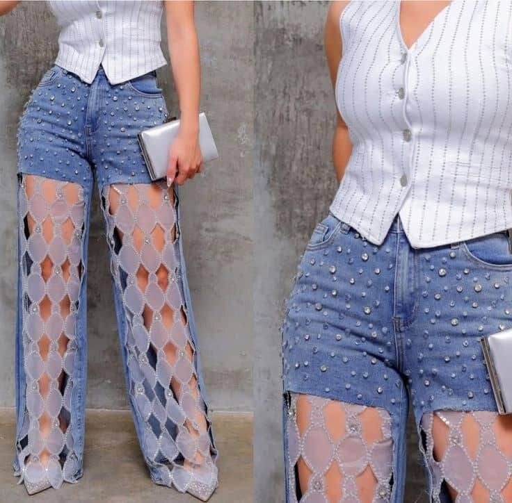 Découvrez ces jeans en denim unique avec détails en mailles pour un look audacieux et tendance. Parfait pour les sorties stylées, ces pantalons combinent confort et originalité. Associez-les avec une veste ou un haut chic pour un effet époustouflant.