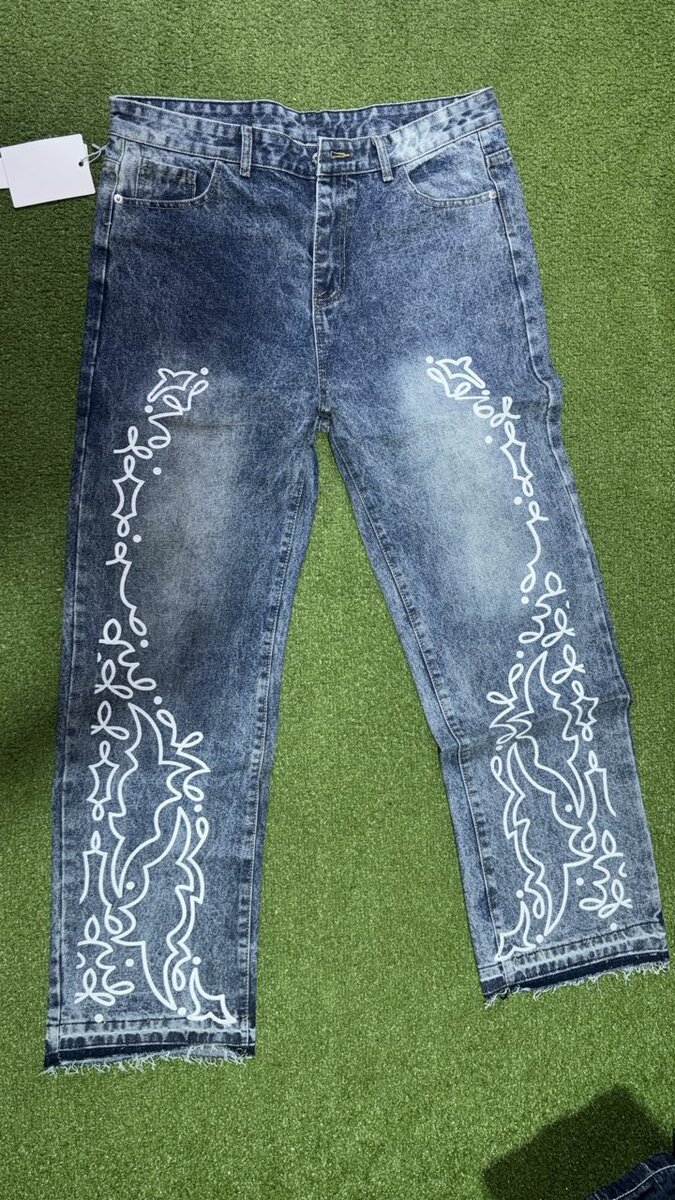 Jeans homme avec broderie moderne. Confortable et élégant, idéal pour un look décontracté ou stylé. Résistant et facile à entretenir.