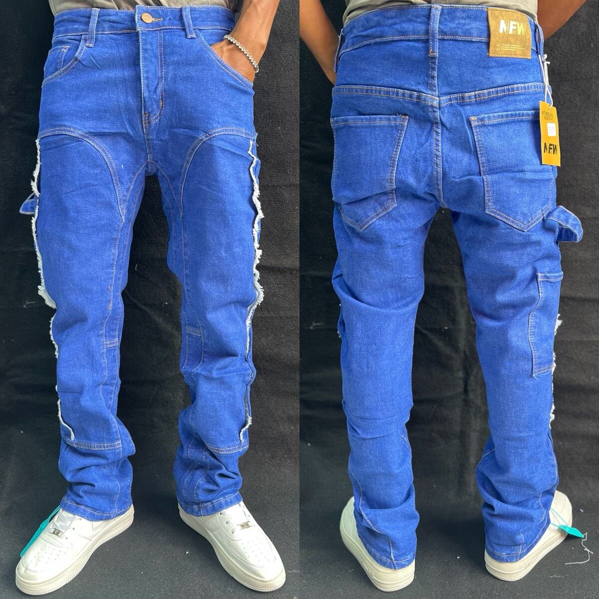 Découvrez ces jeans cargo pour homme, parfaits pour un style décontracté et tendance. Conçus en denim de qualité, ils offrent une coupe confortable et une esthétique moderne avec des détails uniques comme des déchirures et des motifs.